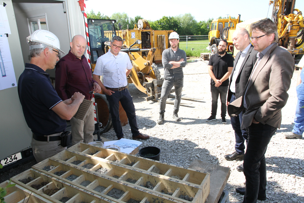Gemeinsam mit dem ZWE-Geschäftsführer Benjamin Batz und seinen Bürgermeisterkollegen Karl-Heiz Wagner (Altendorf), Michael Karmann (Buttenheim) und Gerhard Bauer (Hallerndorf) besichtigte Claus Schwarzmann die Baustelle zwischen Unterstürmig und Buttenheim auf dem Gebiet der Gemeinde Altendorf. „Es läuft alles nach Plan, der Brunnen wird bis Ende Mai fertig gestellt sein“, erläuterte Diplom-Geologe Andreas Gartiser vom beauftragten Ingenieurbüro bei der Ortsbesichtigung. Die Arbeiten für die Brunnenbauarbeiten wurden an die Firma Ochs aus Nürnberg vergeben. Zunächst hatte diese eine 40 Meter tiefe Versuchsbohrung durchgeführt und mit Pumpversuchen im offenen Bohrloch getestet. Diese verliefen äußerst erfolgreich. Nach Rücksprache mit dem geologischen Büro ist dann der Ausbau der Bohrung zu einem Brunnen beschlossen worden. Der zusätzliche Tiefbrunnen erschließt künftig von 14 m bis 40 m grundwasserführende Sandsteine des Rhätolias. Aufgrund der Überdeckung mit schützenden Tonschichten des Lias ist wie bei den übrigen sieben bereits bestehenden Tiefbrunnen ein sehr hoher Schutz gegenüber oberflächennahen Einträgen gewährleistet.